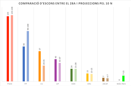 ERC tornaria a guanyar les eleccions de manera clara amb uns 13-15 escons, per damunt del PSC (11-12 escons) i del seu rival independentista JxCat (6-7 escons); seguit d’ECP (6), Ciudadanos (3 escons per Barcelona), Més Pais (2 escons per Barcelona), CUP (1-3 escons), PP (1-2 escons per Barcelona) i Vox (1 escó). Com es pot veure, la majoria dels partits petits només tenen possibilitat d’obtenir escó per la circumscripció de Barcelona, ja que reparteix 32 escons. Els resultats són similars als del 28A, els canvis sorgeixen a causa de la CUP que pot aconseguir escons de l’espai independentista d’ERC i JxCat; i per altra banda Errejón pot fer-se amb escons dels comuns o del PSC.