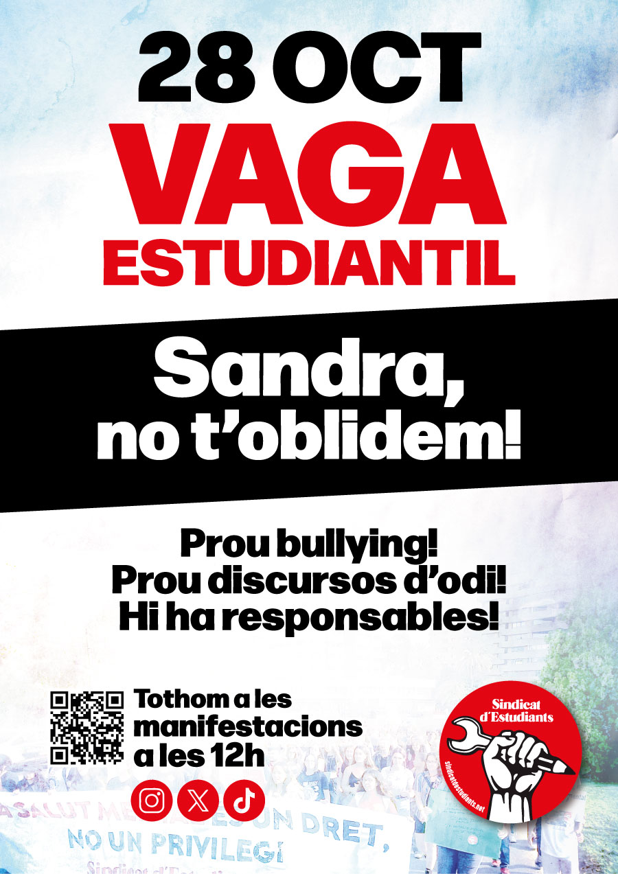 El proper 28 d’octubre, el Sindicat d’Estudiants convoca una nova vaga. Des de l’inici de curs ja se n’han convocat dues, però aquesta ens toca de més a prop. És en memòria de la Sandra, la noia de 14 anys de Sevilla que es va suïcidar després de patir assetjament escolar. El seu no és l’únic cas. Segons un estudi recent, aproximadament dos alumnes per classe a Espanya pateixen assetjament escolar, i una cinquena part d’aquests, ha tingut pensaments suïcides. Així doncs, en aquest context, el Sindicat d’Estudiants llança el crit d’’aturar el bullying” i demana responsabilitats. D’acord.