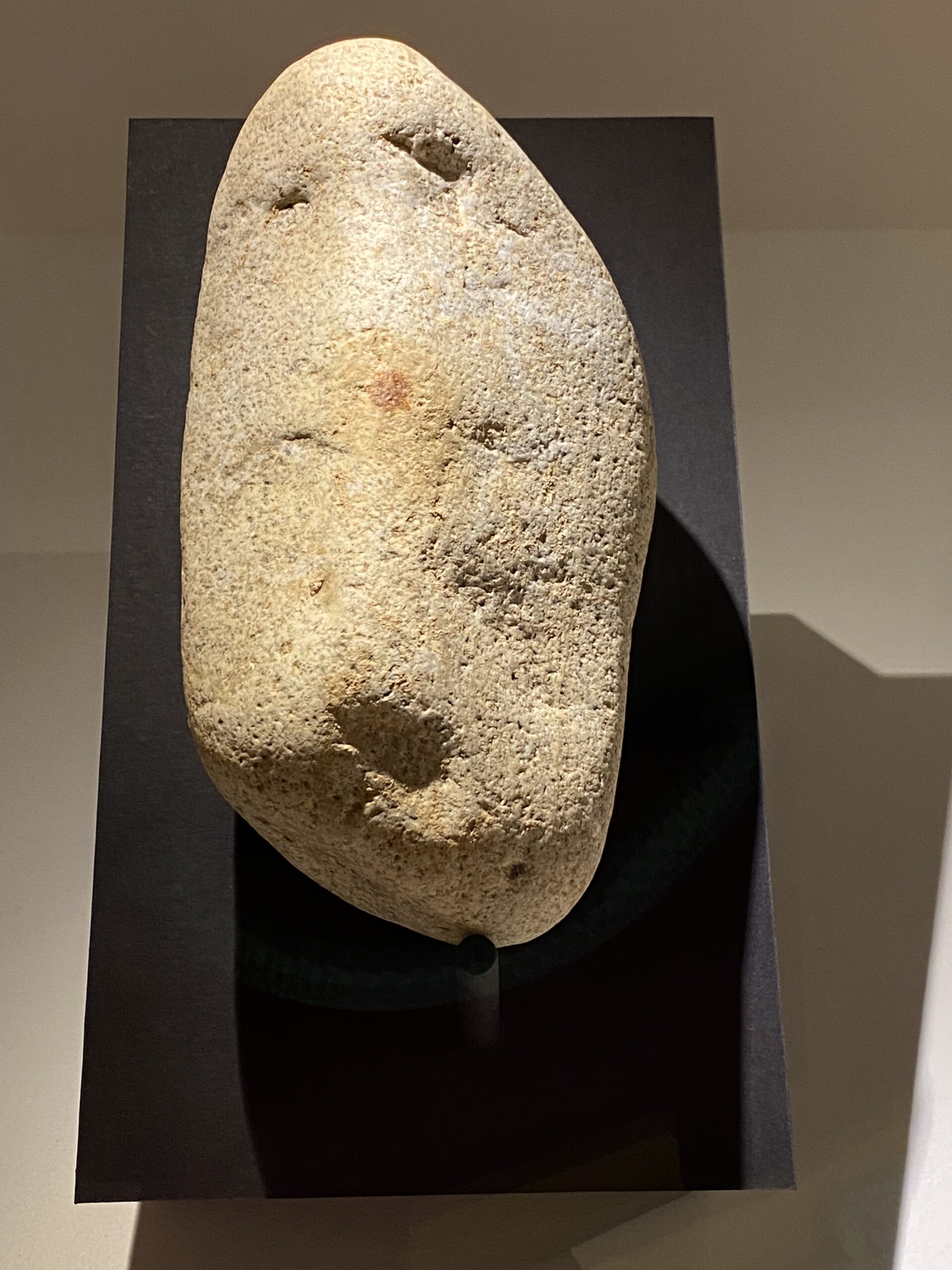 Al National Geographic expliquen que probablement la intenció d’aquell home de la prehistòria era pintar un nas. He de dir que l’empremta està feta amb la punteta del dit. I, per això, a més d’estar al mig d’un troç de pedra ovalat, s’ha deduït que podria representar un nas. Al museu s’explica que igual que nosaltres, els neandertals tenien la capacitat d’experimentar el fenomen psicològic conegut com a pareidolia facial i que consisteix en el fet que el cervell assigne una identitat coneguda a qualsevol objecte, àrea o paisatge de la natura; en aquest cas una pedra amb forma de cara.